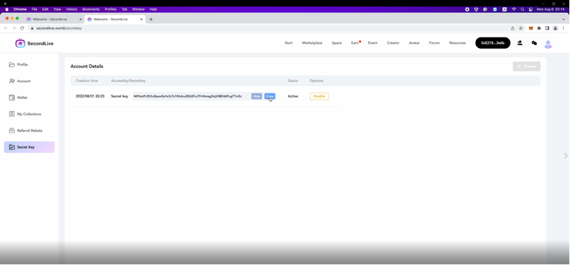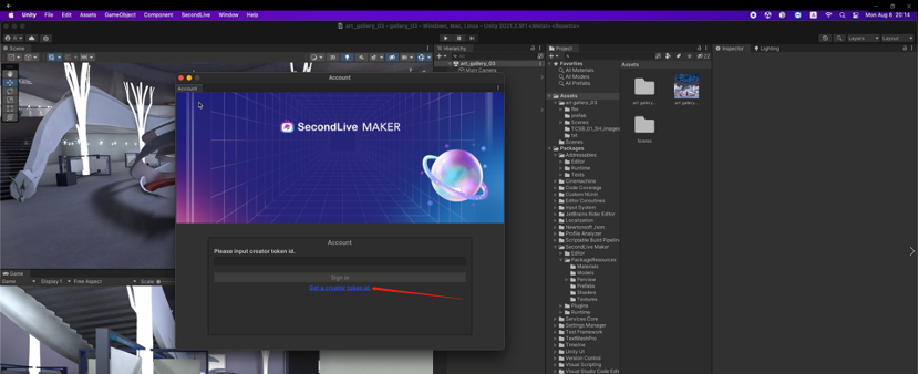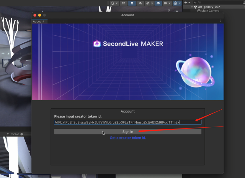 After completing all space editing, click “SecondLive” - ”Authorization” on the top of the page. Click “Get a creator token id” in the popup to connect SecondLive for a Secret Key.